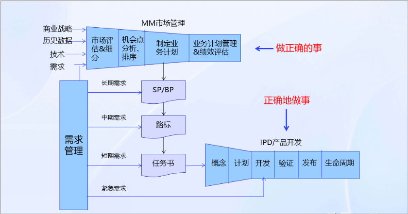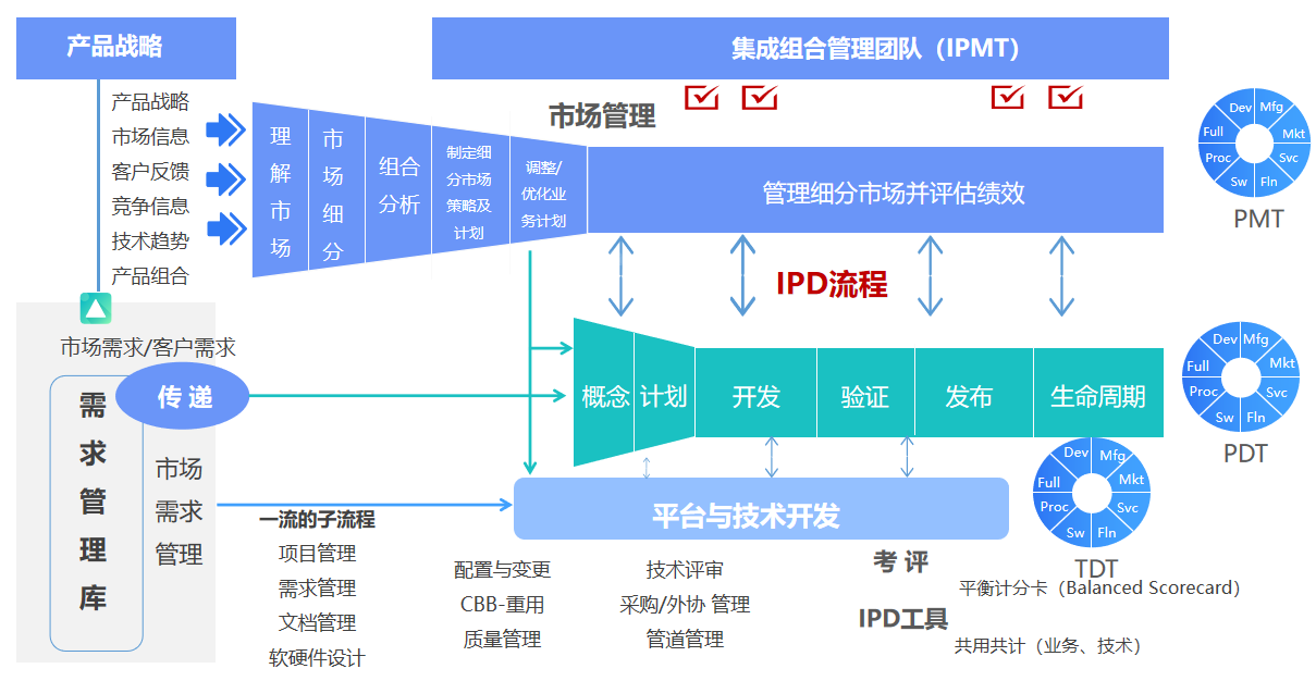 ipd的核心思想包括:把产品开发作为投资来管理、基于市场驱动的产品研发、快速高效地推出产品、在设计中构筑质量和成本优势等。ipd的整体业务框架涵盖产品战略、需求管理、产品开发流程、跨部门团队、业务决策评审和技术评审、度量及改进、cbb-重用、绩效考评等多个方面。