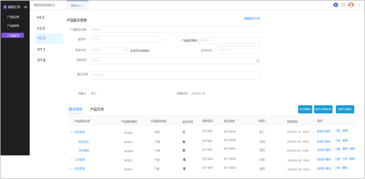 2) 管理产品版本下的树状产品结构(产品模块及子模块);支持产品变更、版本基线查询,产品版本基线对比