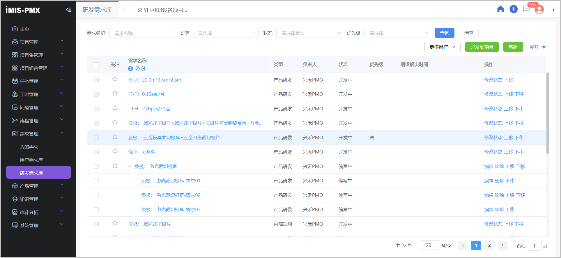 3) 支持用户需求转研发需求、研发需求分发到项目;支持需求关联产品、产品模块;支持用户需求和研发需求库管理